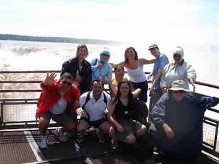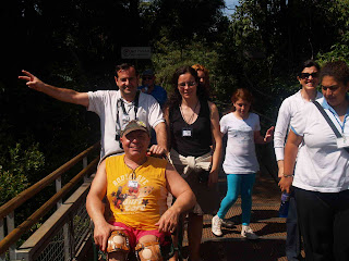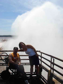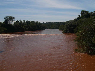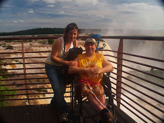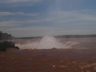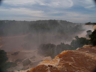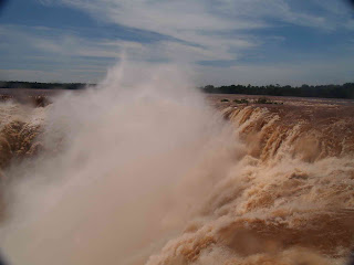 Deciros que el guía, Brasileño y amabilísimo, no se separó de nosotros en ningún momento y fue él quien hizo de porteador con la silla de ruedas e incluso nos hacía las fotos en los diferentes miradores, nos contó que había estado 15 días lloviendo fuertemente aguas arriba, por lo que teníamos la suerte de encontrar las cataras tres veces por encima del nivel normal, en las fotos se aprecia el agua roja de Iguazú y la impresionante fuerza con la que el agua salta al vacío a lo largo de 80 metros de caida.