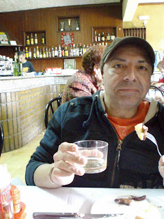 A continuación pudimos elegir entre un montón de platos de primero, otros tantos de segundo y postres variadísimos, a cual con mejor pinta: Eva se pidió una crema de marisco y una merluza asada, yo opté por un foie de pato con confitura de cebolla y un solomillo de cerdo con manzana asada y tarta de Santiago, todo ello regado con una botellita de Ribera del Duero, unos cafés y, como no había que conducir, unos chupitos de hierbas.