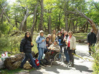 El primer destino es Bahia Onelli, (ampliación en el enlace), aquí el problema para los y las silleros/as puede estar si, como a nosotros, se os ocurre preguntar si podeis realizar la caminata, dependiendo de a quien le pregunteis en el Catamarán os dirán que no, que está muy complicado…. bla bla bla…, bueno, pues ni caso, en las fotos de abajo podeis ver el camino, por el que sale alguna raiz de los ñires, que se atraviesan bien con ayuda y un par de zonas con algo de desnivel, y, por último la zona del lago donde hay alguna piedra, si teneis la suerte de contar con gente como la de nuestro grupo, no tendréis problema y merece la pena. (fotos de abajo: dos instantáneas de la caminata por el bosque de ñires, en la derecha, Fernando, mi gran apoyo en Argentina, su mujer, Rosi y Juan, más al fondo el resto del grupo, Eva, mi mujer, Alicia, la mujer de Juan, Mario y Lola y Nohemi y Belén, "las niñas", todos y todas fueron y son importantes en mi vida ya que gracias a ellos pude desenvolverme por estas bellas tierras.