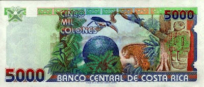 A los billetes de 5.000 Colones los denominan "tucanes", ¿imaginais porqué?.. ¡Muy bien!, por el tucán que aparece en su parte superior.