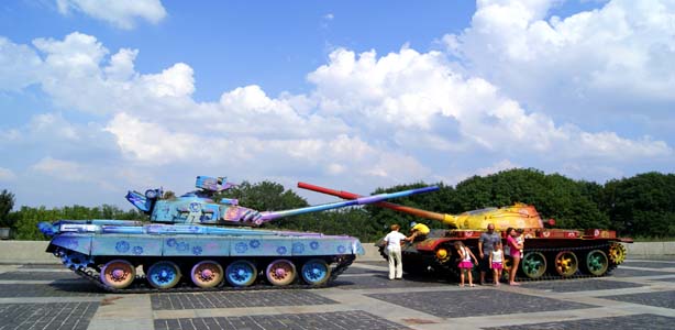-El callejón de las Ciudades Heroicas: es llano, no hay ningún problema. Montones de esculturas parecen seguir luchando contra la invasión de los nazis en 1941. Está representada gente de todas las edades y condiciones, o sino fijaos en el minuto. Una babushka (abuela en ucraniano) porta un misil; y otra, una Kalashnikov. Era una guerra de todos… dicen. Vídeo.
