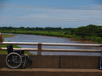 Como se aprecia en la fotografía superior donde vemos mi silla de ruedas plegada, el espacio de las aceras laterales del puente es angosto y no permite manejar una silla de ruedas.